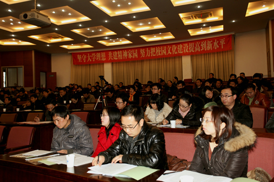 党委副书记周家健作题为《坚守大学理想 共建精神家园 努力把校园文化建设提高到新水平》的报告。报告中,周家健首先指出了对大学文化的认识,认为理解大学文化,要从大学的角度来解读,要从文化的角度来审视,要从本校的角度来分析。周家健阐述了我校校园文化传承与创新的实践,认为特定的办学历史造就了湖师院独特的文化传统,丰厚的地方文化奠定了湖师院鲜明的文化基调,高度的文化自觉确立了湖师院特有的文化品牌。最后,周家健强调了“十二五”期间校园文化建设的总体思路和几项重点工作。“十二五”期间,我校要进一步传承弘扬校本文化,进一步繁荣提升学术文化,进一步培育凝练文化特色,进一步做实做强文化育人,进一步优化文化环境建设。