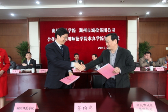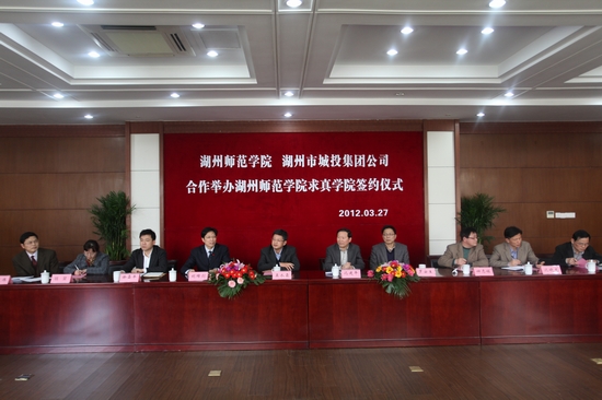 3月27日下午,我校与湖州市城市投资集团公司合作举办求真学院签约仪式。湖州市常务副市长吴水霖、副市长沈建平,市政府副秘书长、办公室主任罗安生,市政府副秘书长徐晏平,市财政地税局副调研员钟志铭、市教育局副局长钱旻、市住房和城乡建设局副局长沈小龙,校长胡璋剑,纪委书记徐桂宝,副校长蒋云良、陆永良,求真学院党委书记陈华斌,市城投公司总经理孙金虎、副总经理费子明、潘海明、全缨、沈俊出席签约仪式。求真学院相关处室,各系、部负责人,市城投公司财务部门负责人参加了签约仪式。签约仪式由副校长方达伟主持。