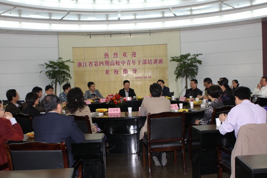 4月18日,浙江省第四期高校中青年干部培训班学员一行50余人在培训班班长、浙江大学党委宣传部部长沈文华,培训班班主任赵仁豪的带领下来我校调研指导工作。校党委副书记周家健出席,党院办、宣传部、招就处、学生处等部门负责人参加会议。