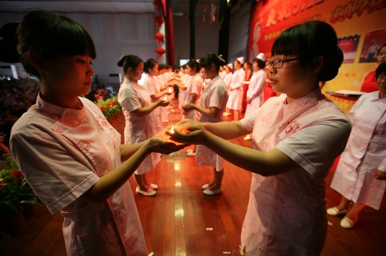护士加冕仪式上,即将进入临床实习的269名护生在庄严的音乐中传递着温暖的烛光,护理界多位前辈为护生们授帽加冕。湖州市护理学会理事长陆烈红带领护生宣誓:坚守救死扶伤信念,永葆天使圣洁,接过前辈手中的蜡烛,燃烧自己,照亮别人,为人类的健康事业而奋斗。