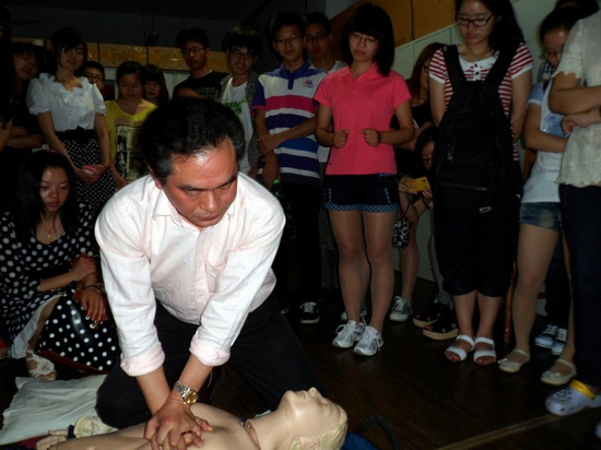 陈老师首先向同学们介绍了心肺复苏的概念、意义及一些日常生活紧急救护的小知识,并强调,心肺复苏术是面对心跳呼吸骤停的伤病员,在4-6分钟内采取的紧急救护措施,科学掌握急救方法是十分必要的。随后,陈老师向同学们详细讲解了心肺复苏过程并亲自示范,同学们也都积极参与,反复练习,整个活动持续了近两个小时,进展非常顺利。