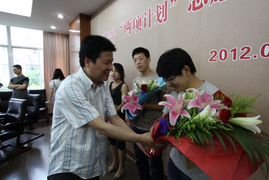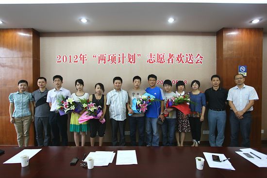 6月18日上午,我校举行2012年“两项计划”志愿者欢送会。校党委副书记周家健出席,各相关职能部门负责人以及志愿者所在学院党委副书记、班主任代表、辅导员等参加了欢送会。