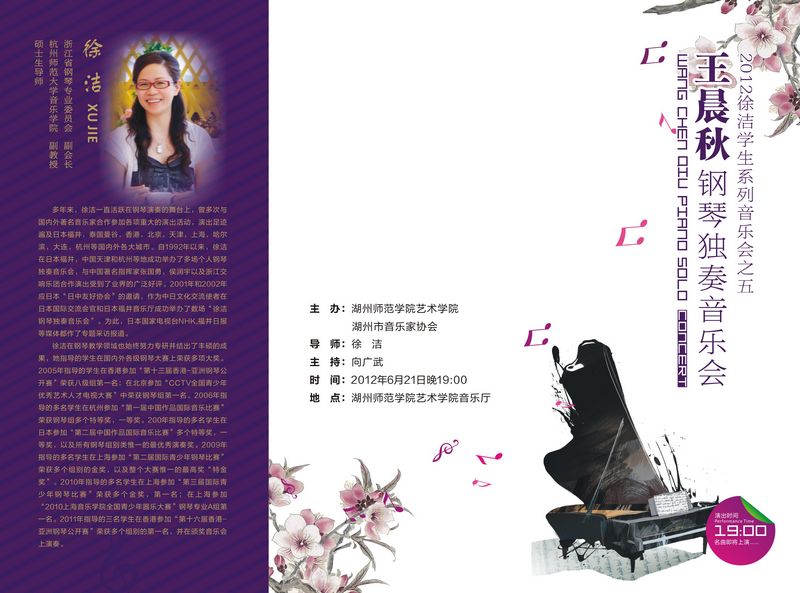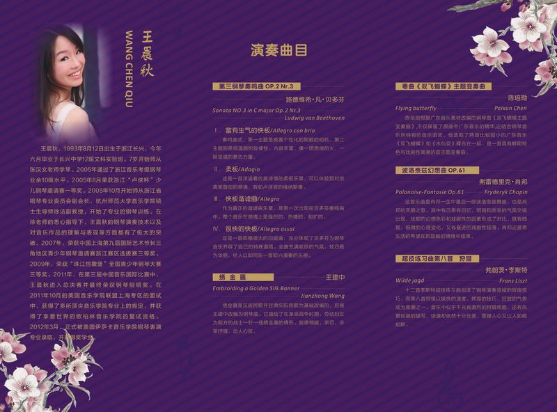 王晨秋:1993年生于浙江长兴,7岁开始学琴。2005年获省“卢俅杯”少年钢琴邀请赛一等奖,并开始师从徐洁老师。在徐洁的精心指导下,钢琴演奏技术和对音乐作品的理解表现都有了很大突破。近年来连获上海第九届国际艺术节长三角地区青少年钢琴邀请赛浙江赛区三等奖、“珠江凯撒堡”全国青少年钢琴大赛三等奖、第三届中国音乐国际比赛钢琴组铜奖。在去年的美国音乐学院联盟上海考区的面试中得到多所顶尖音乐学院的肯定,并获得享誉世界的柏林音乐学院的复试资格。目前,王晨秋正式被美国伊萨卡音乐学院钢琴表演专业录取,并获得奖学金。