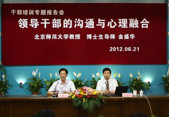 6月21日下午,北京师范大学心理学院教授、博士生导师金盛华教授应邀来校,作“领导干部的沟通与心理融合”干部培训专题报告。学校领导、中层干部、部分管理干部和心理学专业师生代表一起聆听了报告。报告会由党委副书记钱坤方主持。