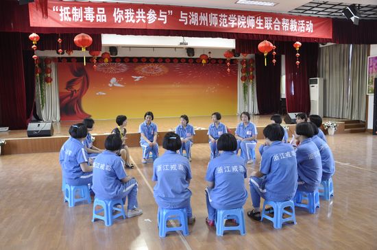 为推进我校共青团组织与省莫干山强制隔离戒毒所开展第二期戒毒帮教志愿服务工作,深化工作内容,加强工作联系,在第26个国际禁毒日来临之际,6月25日下午,我校师生志愿者代表赴所内开展思想品德课程教学观摩点评和面向戒毒学员的团体心理辅导为主要内容的帮教活动。该所副所长袁建萍同志全程参加活动。