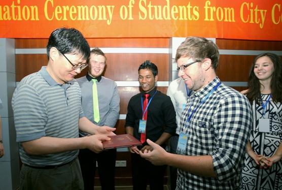 蒋云良为访学团成员逐一颁发结业证书并致辞。蒋云良指出,普利茅斯城市学院与我校合作办学已开展5年,从2007年起,我校已经派出50多名学生前往普利茅斯交流学习,今年是普利茅斯城市学院第一次派出学生来我校学习,标志着双方合作迈入新阶段。蒋云良强调,本批访学团的来访,将进一步扩大提高两校合作的深度和广度,为中英文化交流发挥更大作用。