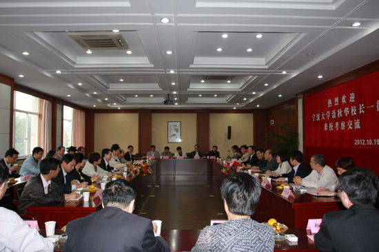 10月19日下午,宁波大学校长聂秋华,副校长赵伐、冯志敏,纪委书记徐茵,校长助理徐铁峰一行来我校交流访问,校党委书记刘剑虹、校长胡璋剑、纪委书记徐桂宝、副校长陆永良出席会议,党委、校长办公室,人事处,教务处,港澳台办公室等部门负责人参加座谈会。