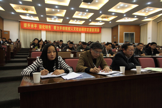 校长胡璋剑作题为《提升水平 强化特色 着力开创我校人文社科发展的新局面》的报告。胡璋剑指出,繁荣我校人文社会科学的主要目标是:遵循内涵发展、特色兴校的道路,到2020年,使我校拥有2个人文社科类硕士点,为建设有特色、高水平的区域性综合大学奠定坚实基础。阶段性目标是2013-2018年实现“1213”的阶段性目标,就是要拥有1个省部级人文社科重点研究基地或省级人文社科创新团队,2个省级重点学科,获得10项省部级及以上奖,30项国家级项目。