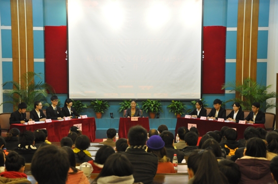 本届辩论赛以“时代青年,聚焦社会”为主题,由校团委、学生会主办,教师教育学院分团委、湖学研究会承办,历时一个多月。经过初赛、复赛的激烈角逐,社会发展与管理学院代表队和求真学院基础部代表队以他们精彩的表现成功晋级冠军争夺战。双方以“物质富裕还是精神富有更有利于幸福感的提升”为辩题,辩手们旁征博引、唇枪舌战,现场观众的互动提问及评委的精彩点评将比赛推向一个又一个高潮。