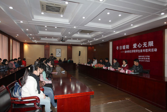 1月6日下午,2013“情暖湖州•红十字博爱送万家”活动暨我校“冬日暖阳 爱心无限”家庭经济困难学生新年慰问活动举行。校党委副书记周家健、市红十字会秘书长金新安、市红十字会业务处处长朱克勤、市中心血站副站长叶玉芳出席,校学工部部长、团委书记,各学院党委、总支副书记及2012年参与无偿献血家庭经济困难学生代表40人参加了本次活动。