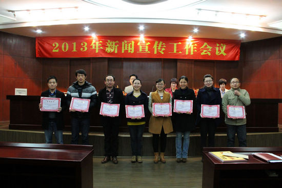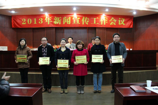 会议表彰了2012年度新闻宣传工作先进集体和先进个人。体育学院、文学院、艺术学院、生命科学学院、教务处、团委六家单位被评为2012年度新闻宣传工作先进集体;蔡维超、李涛、罗琴、曾万泉、程龙、鲁中华、赵亚敏、邹鑫、彭苗苗、胡政被评为2012年度新闻宣传工作先进个人。会上,体育学院、教务处作为先进集体代表,艺术学院程龙作为先进个人代表做了交流发言。