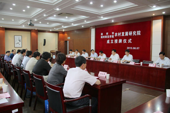 6月7日下午,“湖州市农村发展研究院”和“湖州师范学院农村发展研究院”成立授牌仪式在我校举行。中共湖州市委副书记金建新、湖州市政府副市长崔凤军,浙江省社科联副主席邵清,我校校长胡璋剑、副校长叶金云,浙江大学中国农村发展研究院院长黄祖辉,浙江省农办经济发展处处长楼晓云,湖州市委副秘书长沈昕耀、湖州市政府副秘书长黄文鑫出席,出席会议的还有来自湖州市发改委、市编办、市农办、市财政局、市农业局、市科技局以及省内外高校的相关领导、专家学者。仪式由副校长叶金云主持。