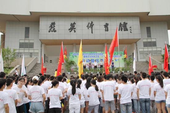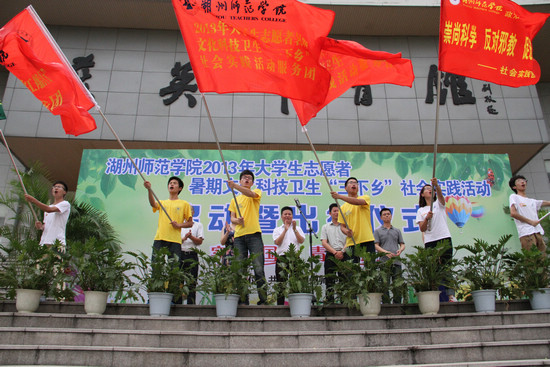 7月7日上午,我校2013年大学生志愿者暑期文化科技卫生“三下乡”社会实践活动启动暨出征仪式在我校燕英体育馆举行。校党委副书记周家健,共青团湖州市委副书记王剑峰出席,校党委宣传部、学工部、校院两级团委负责人及2013年大学生暑期社会实践志愿者代表共同参与了启动仪式。