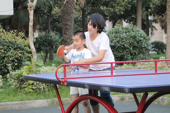 体育学院暑期实践团成员在在教孩子打乒乓球
