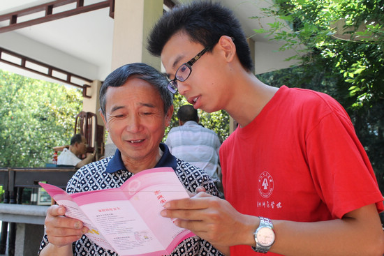 求真学院基础部“四边三化我先行,生态文明筑梦想”宣讲服务团成员为社区老人解读《家庭安全用电手册》