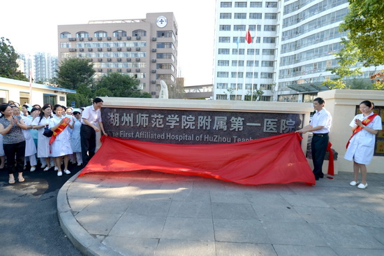 在庄严的国歌声中,国旗、校旗、院旗迎着朝阳冉冉升起,现场领导为分别镶有极富现代感不锈钢字的“湖州市第一人民医院”和“湖州师范学院附属第一医院”两块门牌进行揭牌,新大门正式启动运行。现场数百个彩色气球飞向蓝天,工作人员为前十位进入医院的车主奉上鲜花。