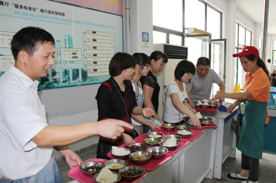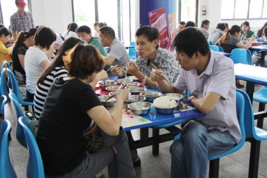新生和家长有序的排队用餐