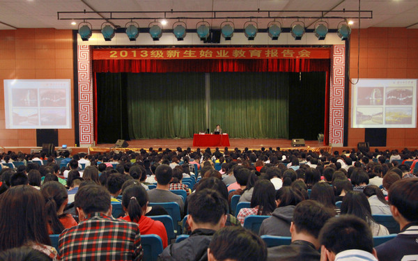 10月16日下午,2013级新生始业教育系列报告会第二场在梦想剧场隆重举行。校长胡璋剑以《牢记使命 志存高远 坚韧不拔 全面发展》为题,慷慨激情地表达了对新生的欢迎,分享了“师院的前世今生”、“对大学生活的理解”两大主题,为新生带来了一场别开生面的精彩报告。