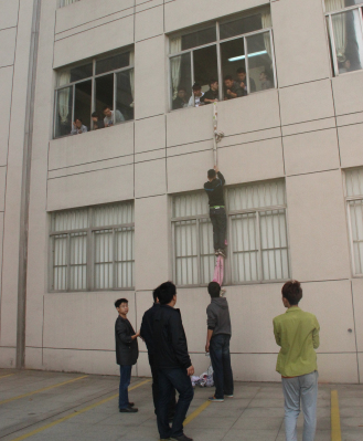 不到20分钟,千余名学生全部成功逃生,8名被困学生被成功营救,5名学生利用床单结绳自救成功。整场演练气氛紧张却有条不紊,最后,市消防支队队长对演练进行评价并对同学们提出消除火灾隐患、如何逃生、学会自救三点思考建议。
