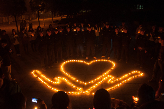 11月21日晚7点,我校师生和保安人员携手在西校区恩泽碑广场举办为“最美保安”——李迎福的祈福活动。