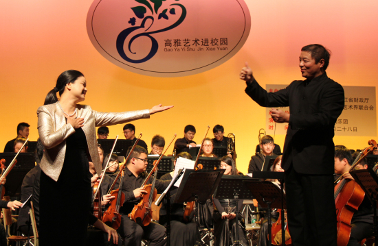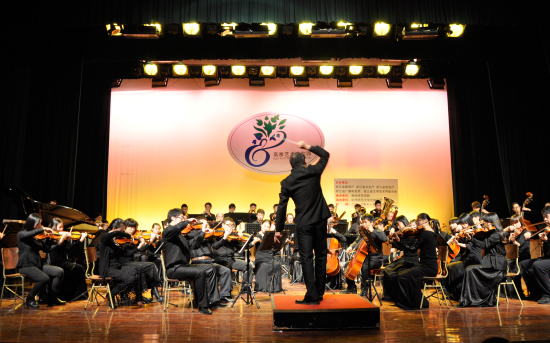 杭州师范大学交响乐团成立于2004年,由该校音乐艺术学院优秀教师和器乐管弦乐专业的学生共同组成,是一支制度较为完善的交响乐团,长期活跃在高雅艺术进校园的舞台上。音乐会由华裔加拿大籍教授刘志培担任指挥,黄玮教授担任领唱。交响乐团为我校师生倾情演奏了《红旗颂》、《命运交响曲》、小提琴协奏曲《梁祝》(选段)、《假面舞会》等交响乐经典曲目,并由黄玮教授带来女高音独唱《我爱你中国》。每一曲经典乐章节奏之后都响起阵阵掌声,并在最后一首《加勒比海盗》组曲结束后,再次以热烈而持续的掌声,把指挥和乐团请回舞台,带来返场表演——歌剧《卡门》序曲。