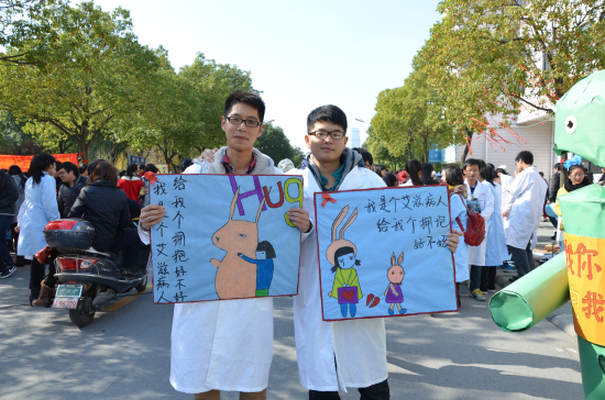 11月28日中午,“亲亲丝带心,浓浓关爱情”艾滋病日宣传活动在中校区顺利开展,阳光医疗服务团及医学院社管会的同学们在夜晚顶着寒风为校园里的树系上象征世界艾滋病日的红丝带并挂上精心设计书写的小卡片,希望用文字表达对艾滋病日的支持及对艾滋病人的关爱,用红丝带唤起同学们“关艾防艾”的意识。活动现场,同学们被新鲜有趣的灯谜吸引,纷纷停下了脚步。他们或相互商量,或在展板上寻找答案,还有同学直接用手机搜索起来,涉及艾滋病等疾病的防治、应急救护技能、常见医疗保健和中医常识等内容的300道灯谜吸引了同学们的普遍关注。在疾控中心、校医院的咨询台前,通过工作人员耐心讲解,同学们不仅对艾滋病的相关知识和防御措施有了更加深刻的了解,也消除了对艾滋病人的恐惧与偏见。他们纷纷通过写寄语、签名、与模拟艾滋病人拥抱等方式表达了对艾滋病人的关心与祝福。此外,由湖州市中心血站提供的血型检测服务和活动现场的抽奖活动也受到了同学们的大力欢迎。