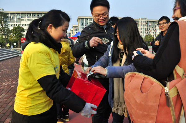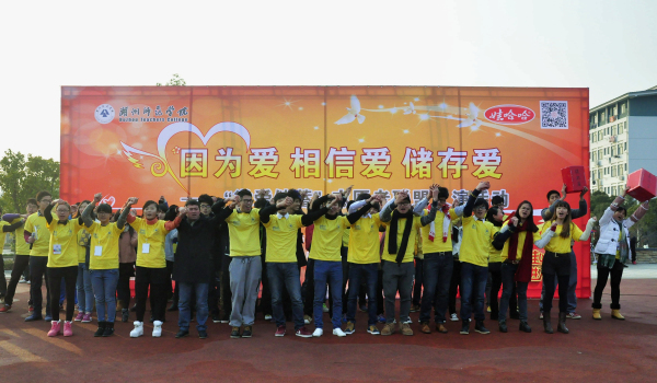 这是一群身着黄色衣服的志愿者,他们手捧红色的募捐箱,伴着舞台上浓浓爱意的歌声,在学校长兴广场上穿梭。广场上的同学一个个把手里的零钱塞到募捐箱,志愿者们向他们鞠躬,道着声声感谢。