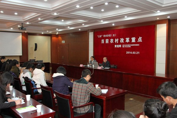 交流会后,黄祖辉作“当前农村改革重点”学术报告,结合十八届三中全会精神,从发挥市场在农业资源配置中的决定性作用、推进城乡发展一体化、赋予农民更多财产权利、加快构建现代农业经营体系等方面进行了详细解读,并围绕“当今‘三农’发展中遇到的热点焦点问题”与现场听众深入互动。湖州市农业局、市社科联、市农科院等部门相关负责人和校“三农”学生社团成员一起到场聆听了报告。