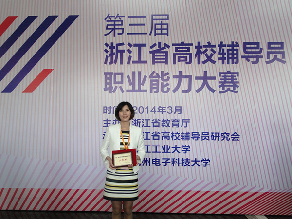 3月26日,第三届浙江省高校辅导员职业技能竞赛决赛在杭州电子科技大学举行,我校辅导员许金凤荣获二等奖。校学工部负责人带领各学院辅导员代表全程观摩比赛。