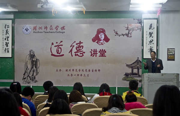 道德讲堂由“唱歌曲、看短片、诵经典、听故事、做点评”五个环节组成。一曲“我的中国心”拉开了活动序幕,朴实的歌词,激昂的旋律点燃了现场每个人的情绪。之后,大家观看了感动中国人物刘盛兰老人的感人故事,同学们被老人家人格的力量震撼了心灵。“信言不美,美言不信。善者不辩,辩者不善。知者不博,博者不知”,在宣讲员带领下大家一起诵读经典,感受经典道德语录的力量。来自政治学院的沈晓阳教授与在场的同学们分享了当今社会如何学习践行雷锋精神,他建议同学们学雷锋时要有自我保护意识,从力所能及的事做起,培育仁爱之心。
