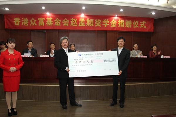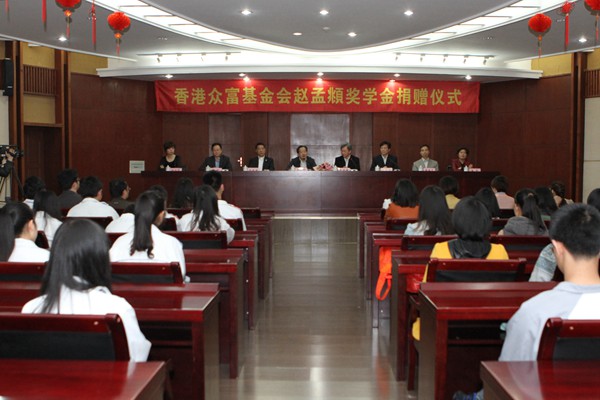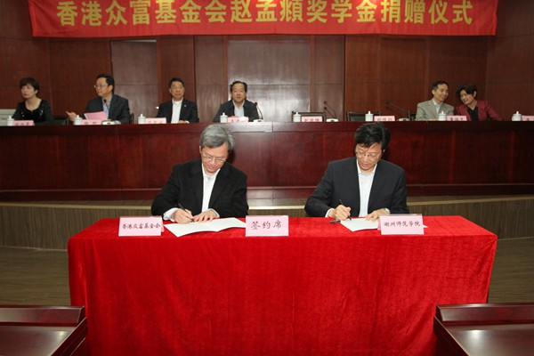4月19日上午,香港众富基金会赵孟頫奖学金捐赠仪式在我校隆重举行。香港长江实业集团有限公司执行董事、香港众富基金会主席赵国雄,香港浸会大学校长、中国科学院院士陈新滋,香港置富投资有限公司董事总经理黄福光,副市长李建平、市政府副秘书长徐旭萍、教育局局长潘音,我校校长胡璋剑、党委副书记杨柳出席,学校相关部门负责人,教师、学生代表参加了仪式。仪式由杨柳主持。