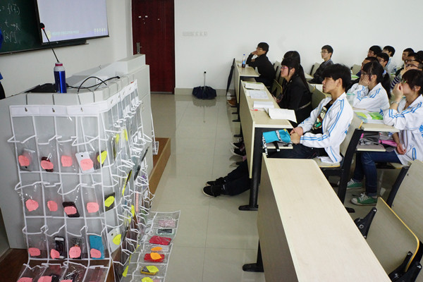 如何改善这一情况,把学生精力回归课程和学业?从4月份开始,工学院在2013级试点“无手机课堂”,给每个班级配上统一的手机袋挂在讲台上,袋上写好每个学生的姓名,给手机安家,让学生安心地上课。
