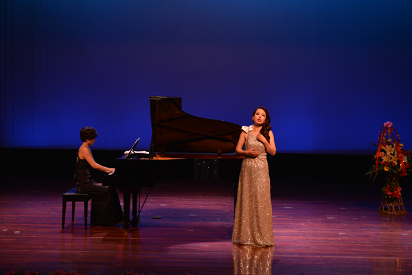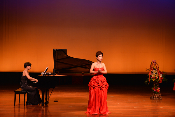 音乐会上半场是中国近现代艺术歌曲专场,翟亚宏老师演唱了我国著名的近现代作曲家青主、黄自、江定仙等人的7部优秀作品,优美的歌声和与艺术指导苏燕老师美丽琴声的默契配合,美妙的东方韵味令观众深深地陶醉在音乐的世界中。《思乡》、《岁月悠悠》、《长相知》、《阳关三叠》、《我住长江头》的演绎情深意切,对家人、对时间、对故土的眷念之情催人泪下。《玫瑰三愿》在两人的演绎下生动的刻画了一位柔弱无力、不甘命运安排的女子憧憬美好未来,希望得到他人的关爱的心境,演唱者更是很好表现了歌曲精致的速度、力度安排。翟亚宏演唱的《春思曲》首段轻柔飘逸,表现出入诗般的离愁雨夜,后半段面对多次的移调和转调处理成熟内敛,将曲中少妇为爱焦躁不安却深藏心底的复杂情绪表现的淋漓尽致。