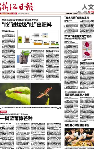 6月6日是世界环境日,《浙江日报》人文版头条以《我省成功研发餐厨垃圾集成处理设备》为题,报道我校车磊博士成功研发餐厨垃圾集成处理设备投入使用,节能环保的厨余垃圾处理新模式受到居民好评。