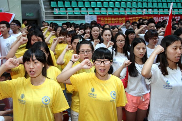 “我承诺:在暑期社会实践期间,积极发扬志愿者精神,传播先进文化。在过程中勤学,求得真知,在服务中修德,提升自我修养,在奋斗中笃实,脚踏实地,聚力青春”,燕英体育馆篮球场上,2014暑期社会实践活动志愿者庄重地宣誓。