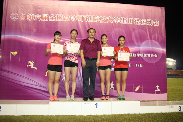7月18日,在刚刚结束的第六届全国高等师范院校大学生田径运动会的赛场上,我校田径队一举夺得女子100米、200米、4×100米等三个项目的金牌、女子200米、4×400米等两个项目的银牌和女子100米的铜牌,并获丙组女子团体总分第四的佳绩。