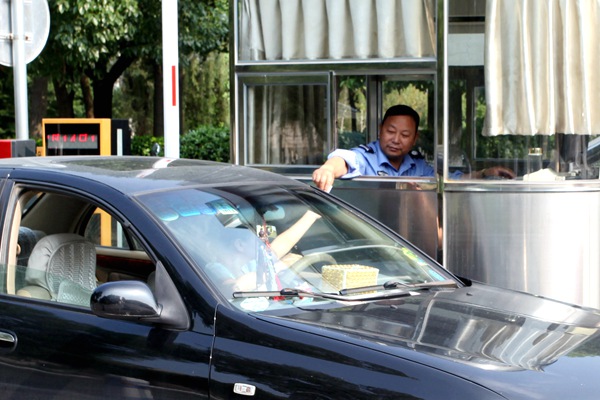 校保卫队的何大哥在酷暑中坚守交通治安亭