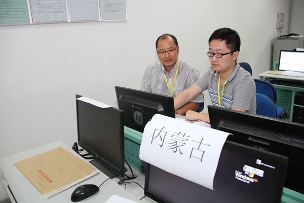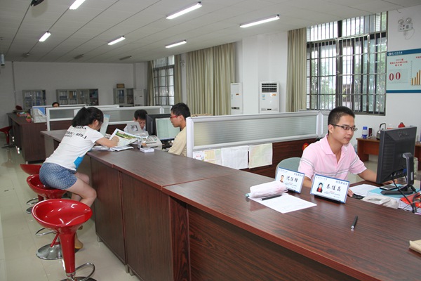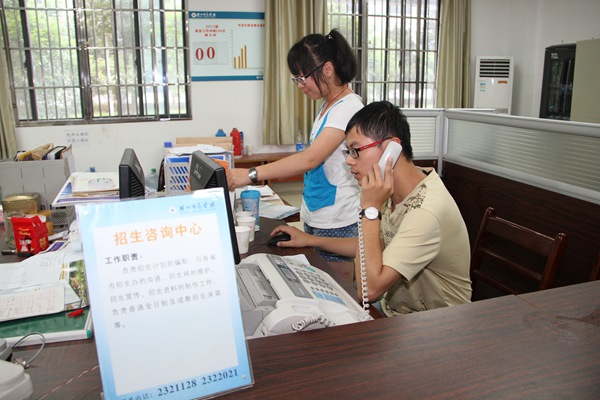 暑期正值招生季,对于招生就业处处长陈国锋老师(左)来说是最忙的时候,图为他和工作人员全身心投入到工作中