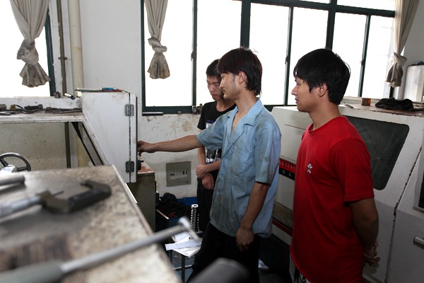 工学院的王栋才和冯文韬同学正在师傅的带领下学习使用学院实习车间里的机器