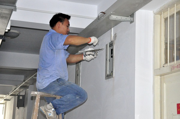 趁着假期,学校对部分旧宿舍进行了修葺,图为工人师傅正在施工