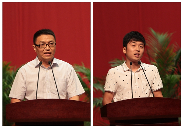 2014年省高校优秀教师、我校首届“陆增镛教师奖”获奖者,理学院陈雪东教授作为教师代表上台发言。陈教授回顾了自己25年来的教学生涯,表示要努力成为一名“崇尚师德”的践行者,让教育回归本质,让学生获得更好的引导与关爱。