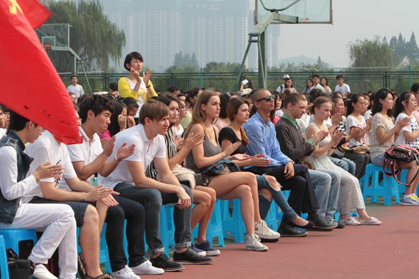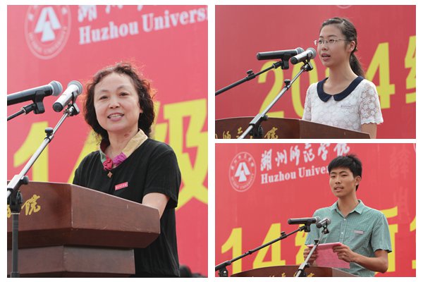 商学院龚正同学代表老生欢迎2014级新同学加入湖州师院这个大家庭,希望学弟学妹们不仅要珍惜宝贵的读书时光,还要注重自身能力的培养,为母校的明天增添光彩。求真学院体育系徐禹强同学代表新生发言,立志在大学四年的学习生活中,努力学好专业知识,勤奋练习专业技能,同时培养高尚的道德情操,为今后成为一名合格的大学毕业生打下坚实的基础。