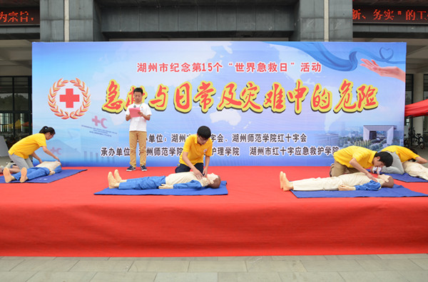 9月17日下午,湖州市纪念第15个“世界急救日”活动在我校开展。校党委副书记、校红十字会会长杨柳出席,湖州市和吴兴区红十字会、校团委、保卫处、医学院•护理学院相关负责人,各二级学院师生代表、公寓系统师生代表及医学院阳光医疗服务团志愿者近400人参加了本次活动。活动由湖州市红十字会和我校红十字会联合主办,我校医学院•护理学院和湖州市红十字应急救护学院承办。