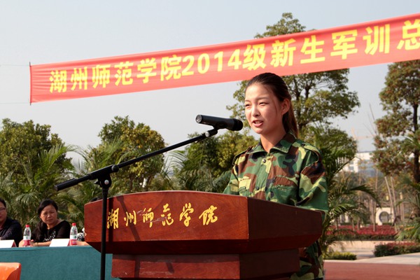 2014级新生军训代表金祎上台发表军训感言,号召同学们把军训期间培养的顽强拼搏的作风、团结协作的精神、严明的纪律和良好的行为习惯,带到大学的学习和生活中去,争做一名新时代的优秀大学生。
