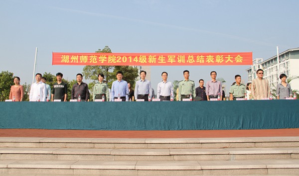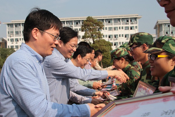 10月20日上午,我校隆重举行2014级新生军训总结表彰大会。校长胡璋剑、党委副书记杨柳、副校长蒋云良、2014级新生军训团团长吴永明出席,校军训领导小组成员、承训教官、指导员和2014级全体参训同学参加了总结表彰会。表彰会由蒋云良主持。