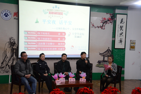 12月22日,校保卫处举办第五届 “平安夜 话平安”暨主题为 “法制在我心中,安全伴我成长”第38讲大学生论坛。保卫处相关负责人、龙泉派出所校区民警杨警官与来自二级学院的近400名学生代表共话平安话题。