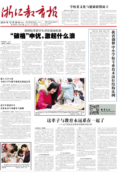 12月26日出版的《浙江教育报》在第一版头条位置,以《“破格”申优,激起什么浪 湖师院革新学生评价激励机制》为题,对我校学生评价激励机制改革进行了重点报道。