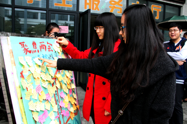 此外,政治学院还面向全体学生召开模拟新闻发布会,以你问我答的形式调动同学们对“两会”的兴趣,使其深刻体会到当代大学生肩负的责任。会议厅的门口放置了交流互动展板,同学们纷纷在便利贴上写下对“两会”的看法、建议。