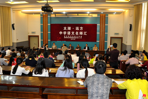 4月1日下午,“太湖·远方——中学语文名师汇”活动在我校7-303学术报告厅开幕。校党委副书记杨柳出席,全国著名特级教师、语文教育专家钱梦龙、朱震国、金军华,校友代表省教坛新秀肖培东和来自浙江、上海、江苏、安徽及湖州市三县两区的中学教师、文学院相关负责人及师生代表共200余人参加活动。