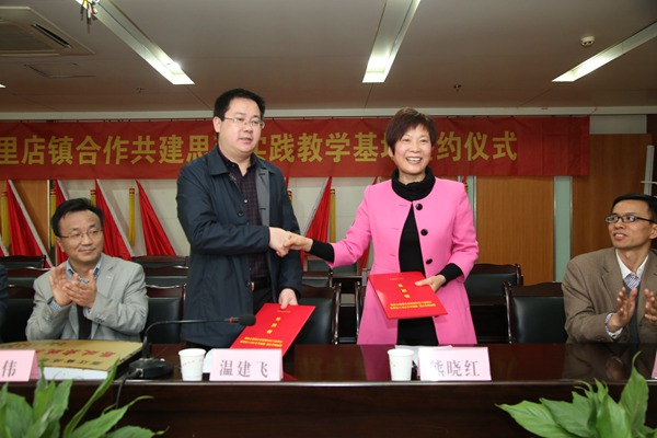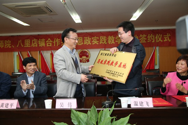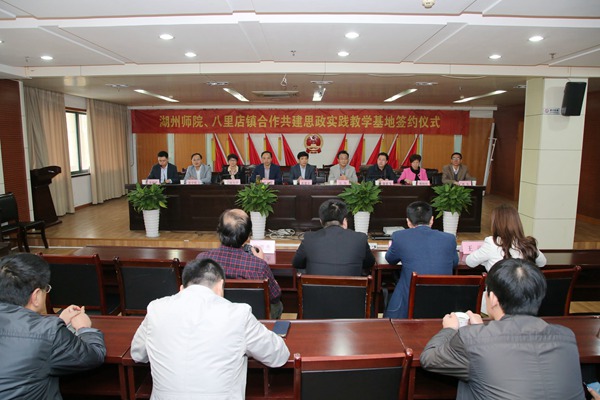 为贯彻落实中共中央、中宣部、教育部关于加强大学生思想政治教育和思想政治理论课实践教学基地建设的文件精神,落实省委宣传部、省委教育工委关于开展“百校联百镇”活动的要求, 4月16日下午,学校与吴兴区八里店镇合作共建浙江省高校思政实践教学基地签约挂牌仪式在八里店镇政府举行。校党委副书记黄建平,市委宣传部常务副部长吴伟,校党委委员、宣传部长何小青,吴兴区委常委、宣传部长茅利荣,吴兴区政府副区长、八里店镇党委书记温建飞,八里店镇镇长张学民,湖州马克思主义讲习所所长、政治学院院长熊晓红出席,我校教务处、校团委相关负责人、思政理论课教师代表和八里店镇机关干部、村干部参加了签约授牌仪式。
